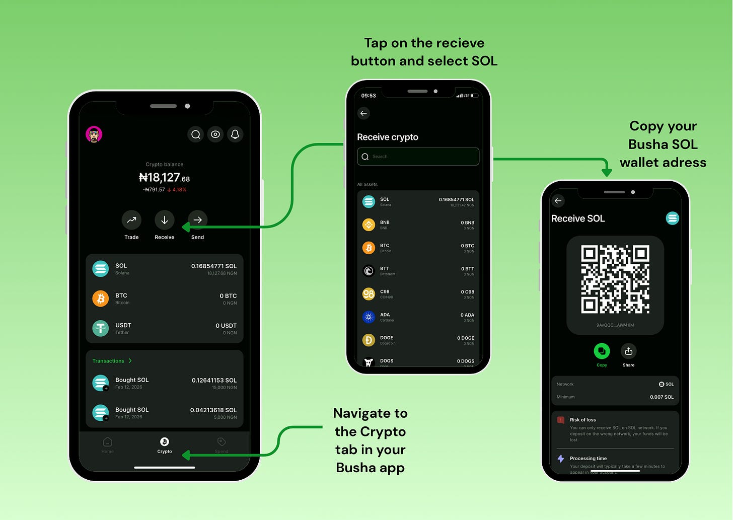 You’ll see your Busha SOL wallet address displayed as both a QR code and a text string. You can share this address or copy it to send SOL from another wallet or exchange.