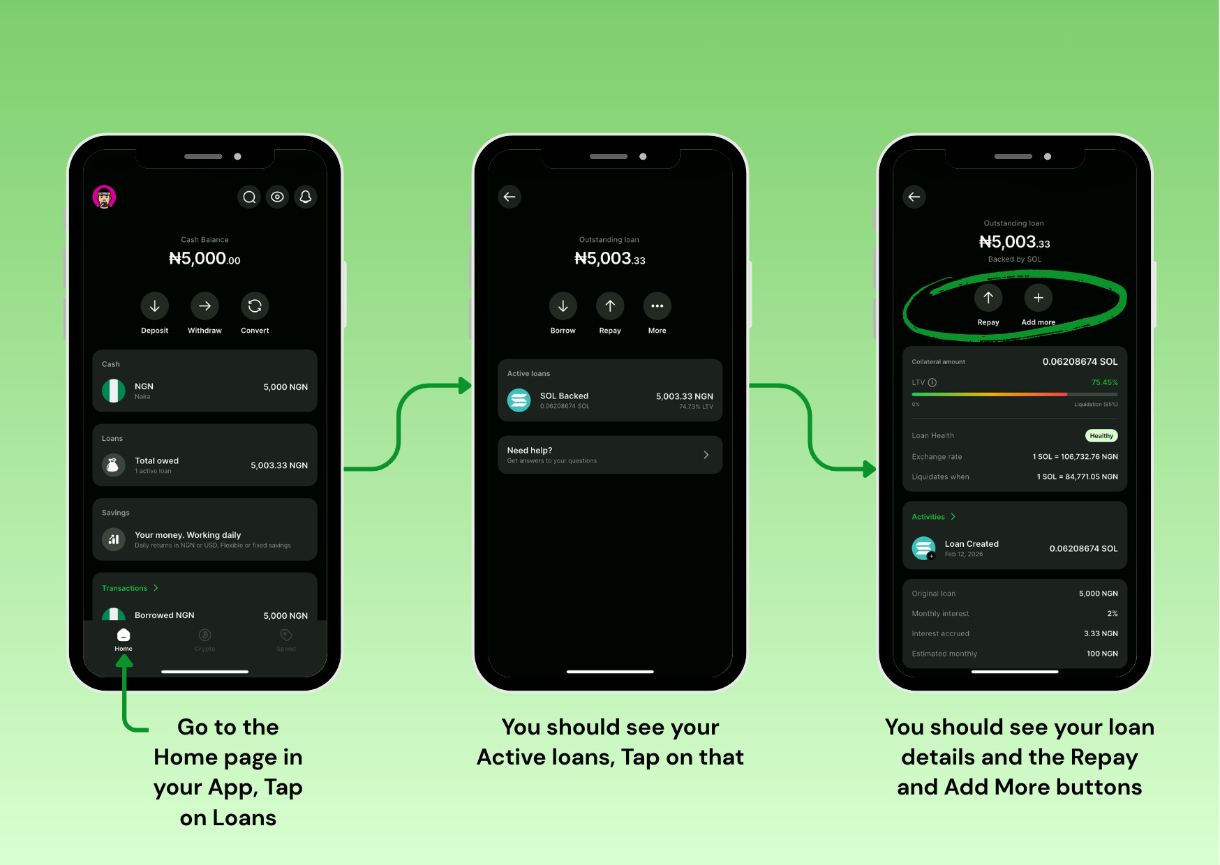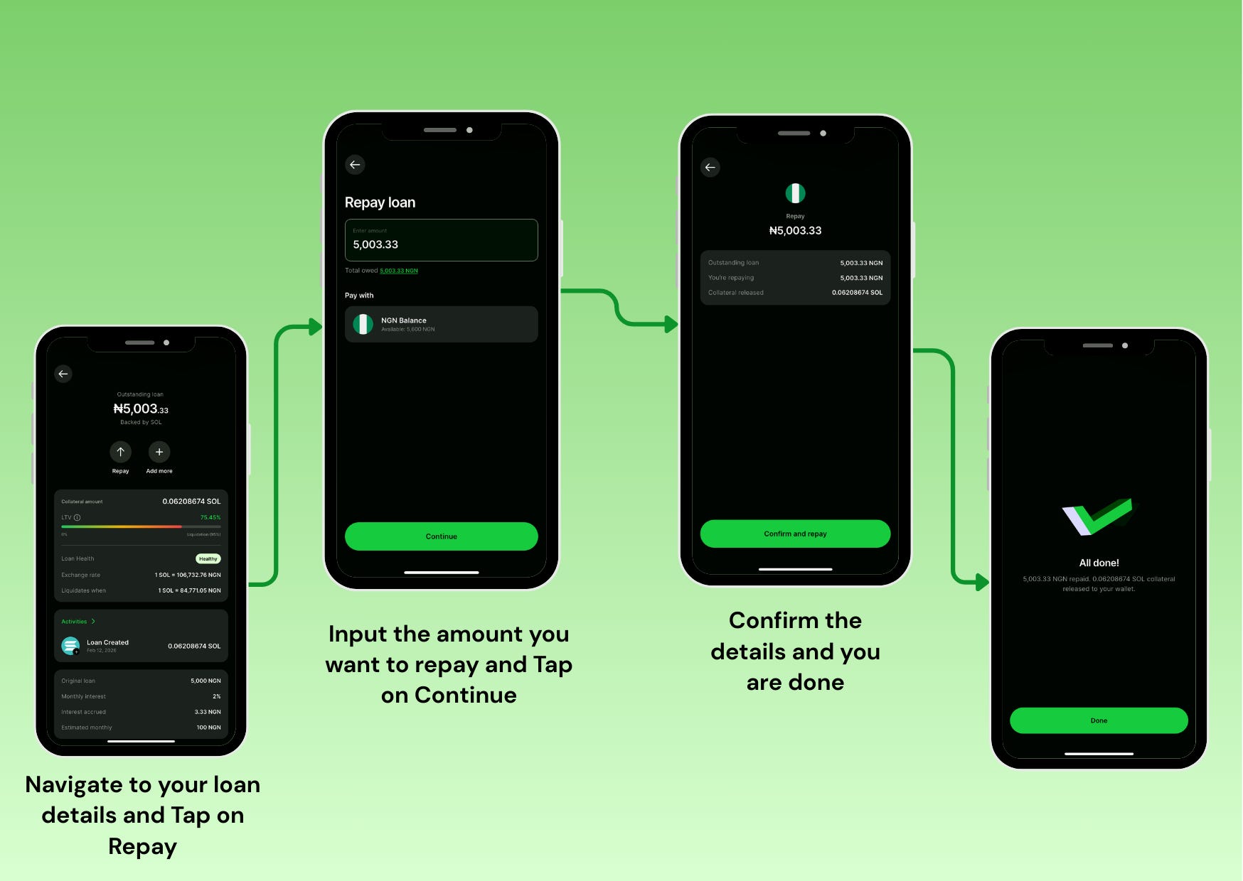 With SOL in your wallet, you’re ready to borrow. The process from seeing your loan offer to receiving naira takes just a few taps.