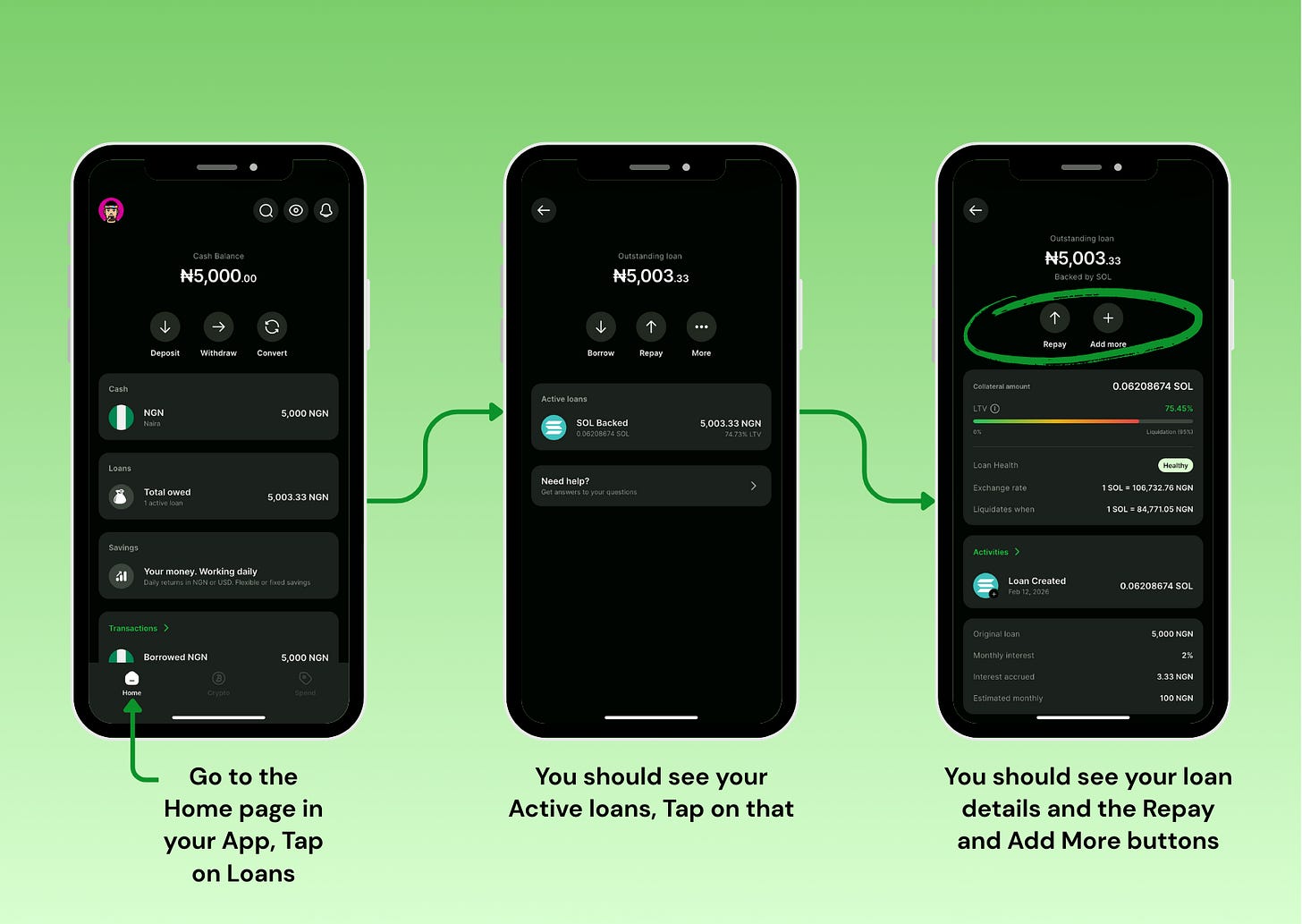 At the top, your outstanding loan amount (₦5,003.33) is backed by SOL, with two action buttons: Repay and Add more.